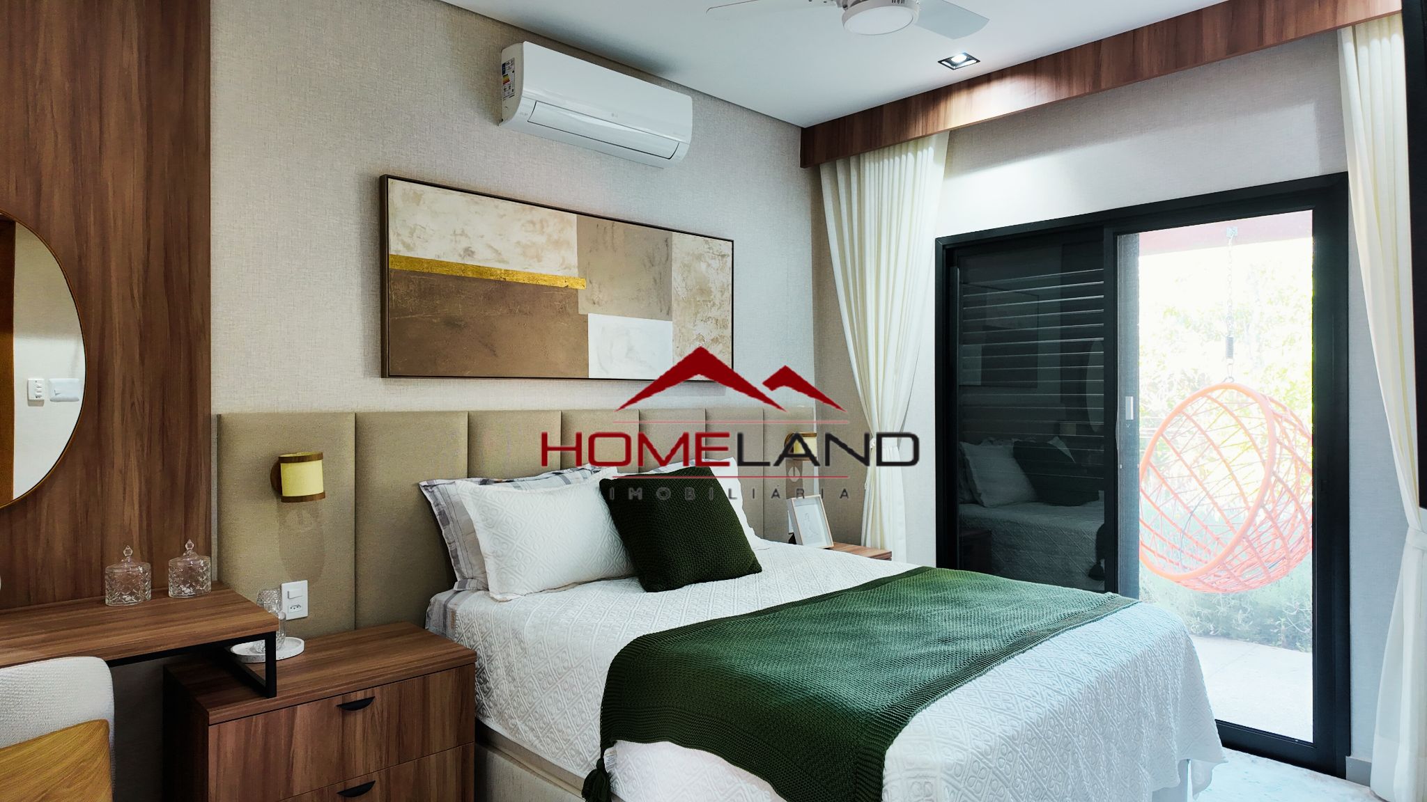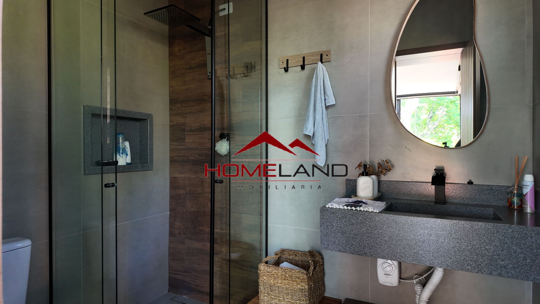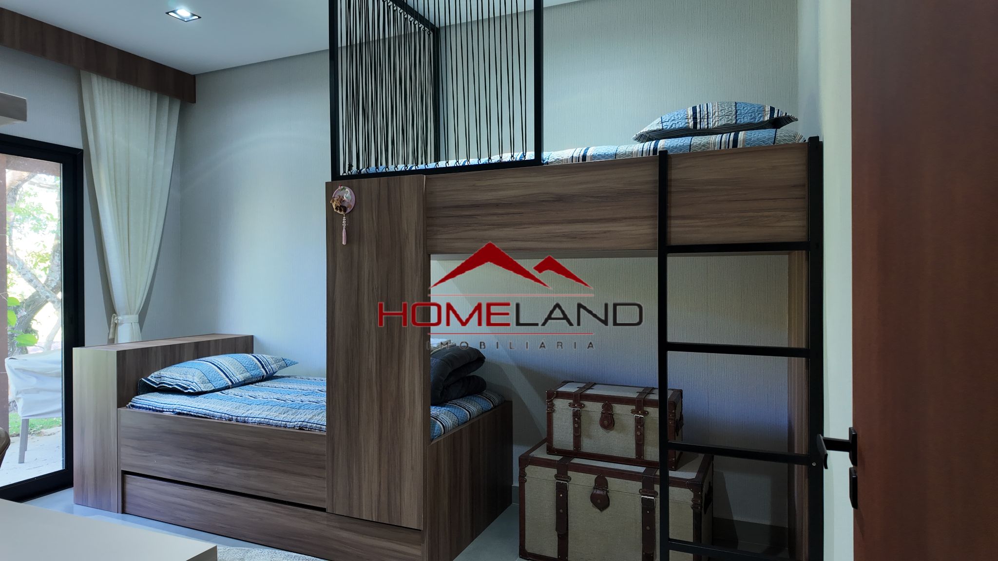 Uma suíte e 2 quartos. Cozinha integrada com sala de jantar e sala de estar com lareira. Ambientes com ar condicionado.