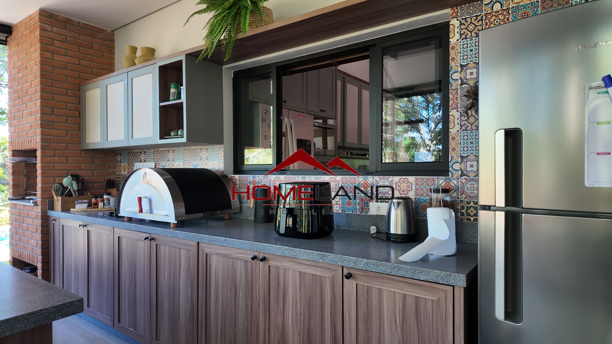 Espaço gourmet amplo, equipado com churrasqueira e forno de pizza. Totalmente envidraçado, cortinas com acionamento elétrico permitem fechamento completo da área.